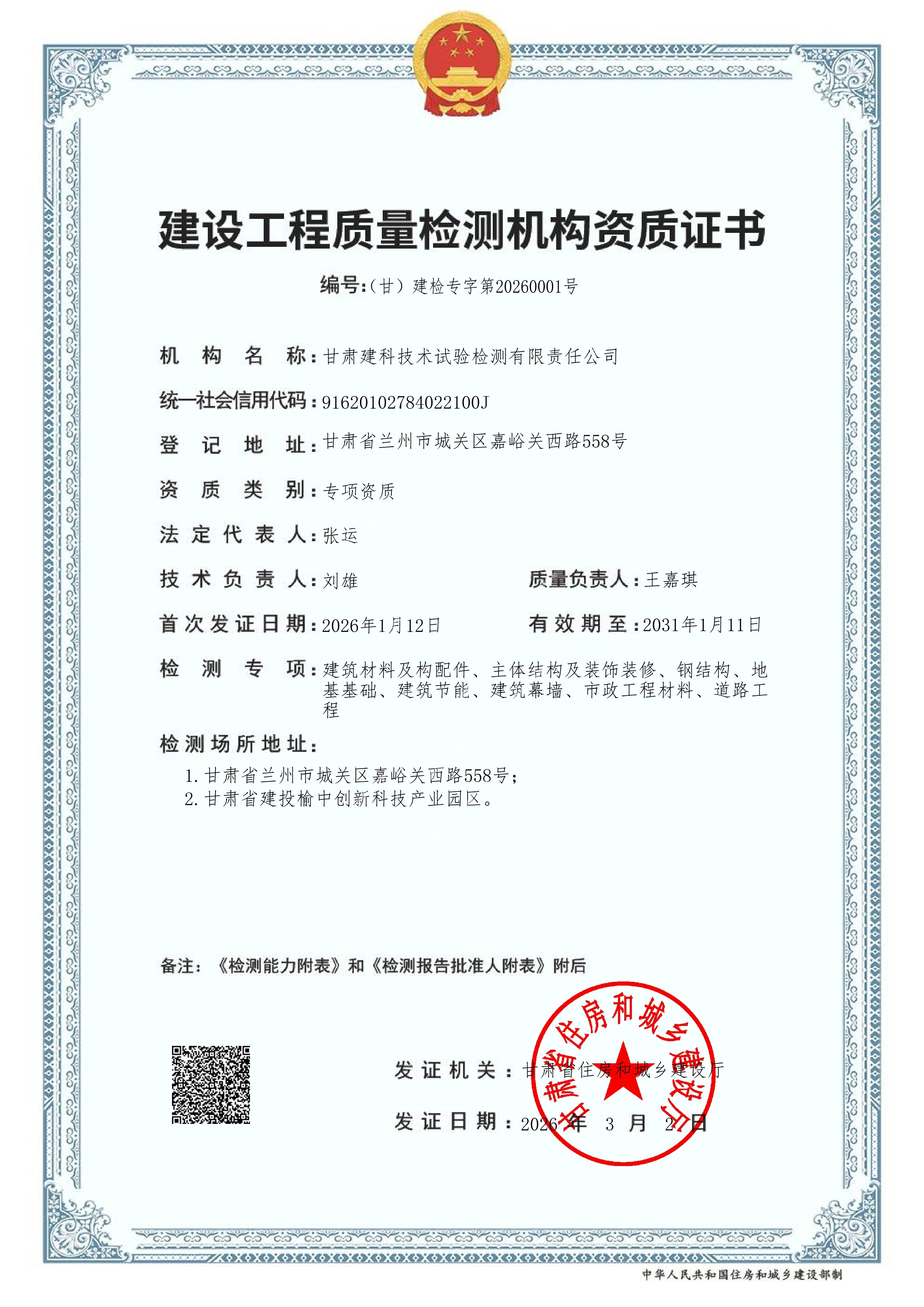经甘肃省住房和城乡建设厅全流程严苛审核评定,建科公司顺利通过资质到期重新核定,成功获颁建设工程质量检测机构专项资质证书,标志着其在检测领域的技术与管理水平持续符合官方标准并获权威认可,为2026年高质量发展开好局、起好步。